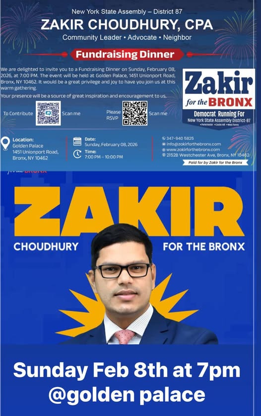 A fundraising dinner for Zakir Chowdhury, CPA, the Bangladeshi community’s nominated candidate for the Assemblyman position from District 87 (Bronx) in the upcoming Democratic primary election in New York State.